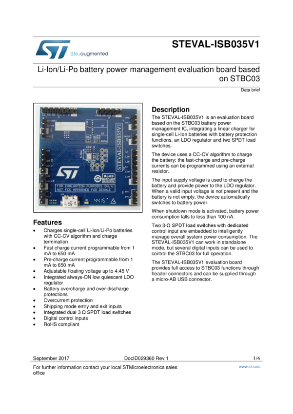 STEVAL-ISB035V1 Li-Ion/Li-Po battery power management evaluation board based on STBC03