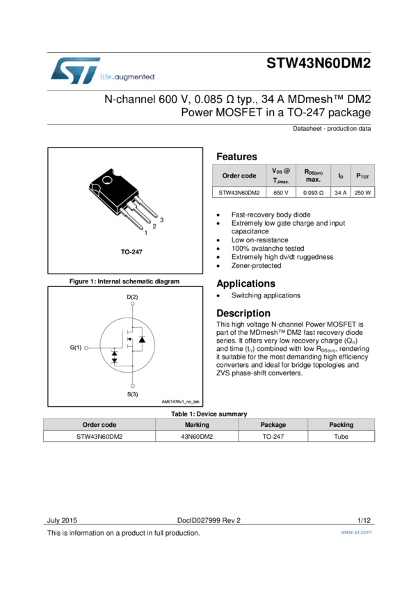 STW43N60DM2 N-channel 600 V, 0.085 Ohm typ., 34 A MDmesh DM2 Power MOSFET in TO-247 pac...