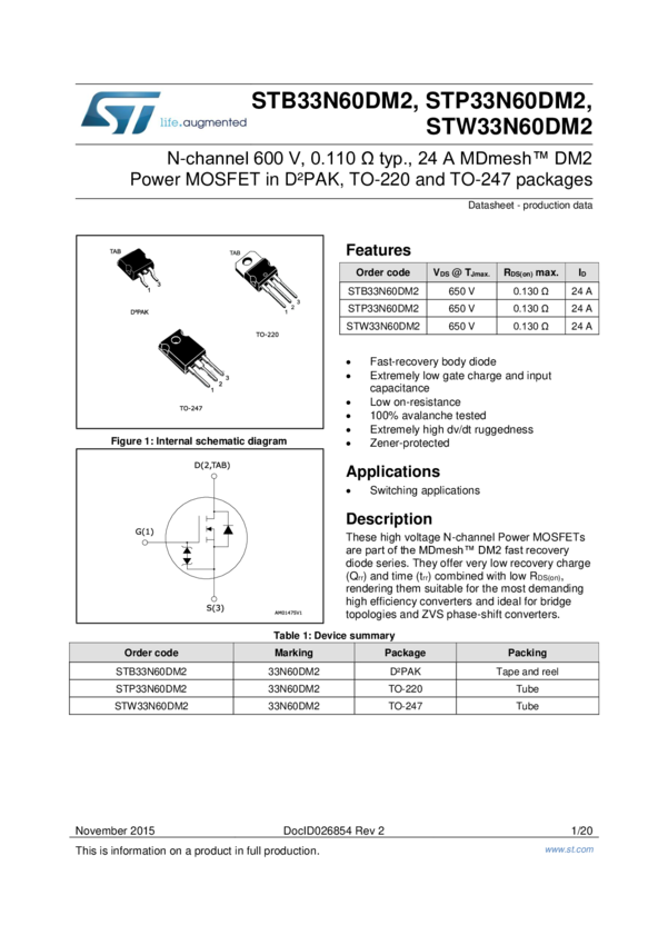 STB33N60DM2 N-channel 600 V, 0.110 Ohm typ., 24 A MDmesh DM2 Power MOSFET in D2PAK pack...