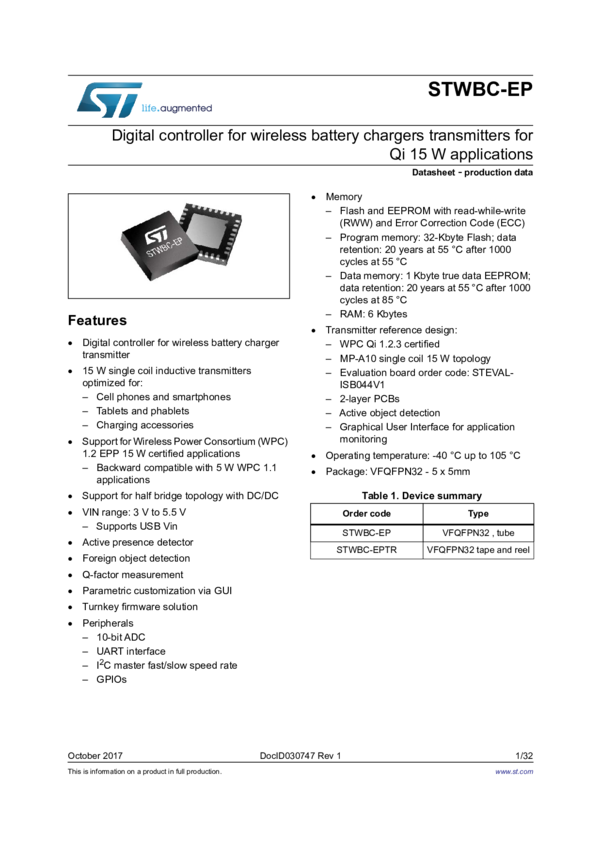 STWBC-EP Digital controller for wireless battery charger transmitters (WBC) in 15 W...