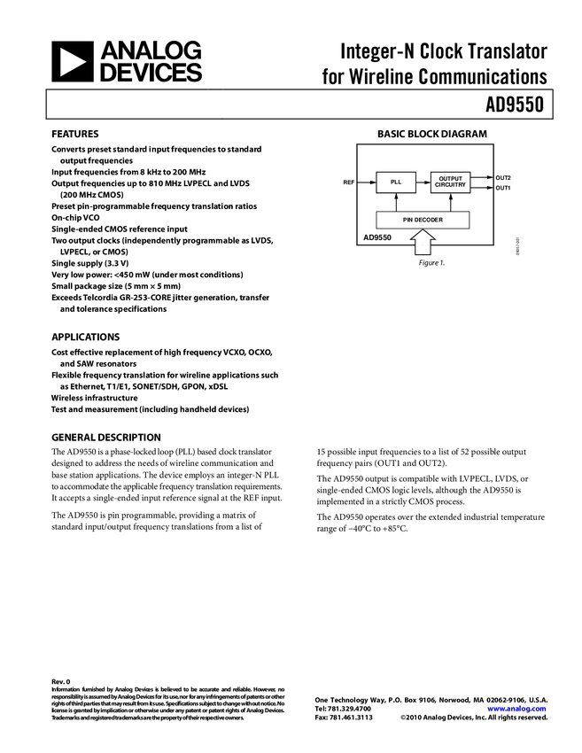 AD9550 Integer-N Clock Translator for Wireline Communications
