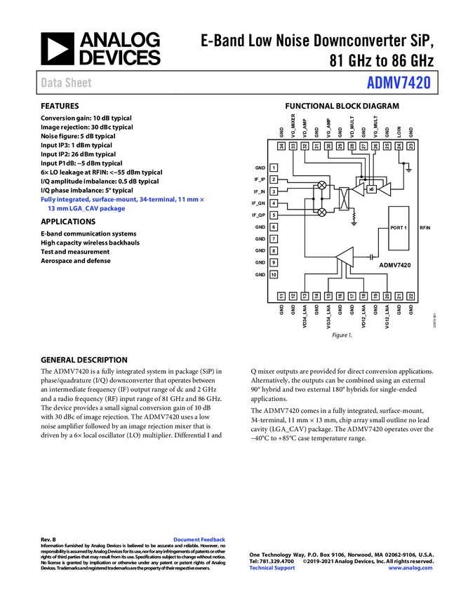 ADMV7420 E-Band Low Noise Downconverter SiP, 81 GHz to 86 GHz