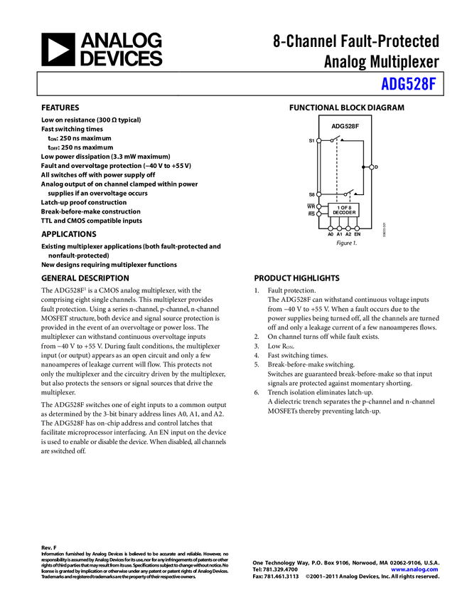 ADG528F 4-Channel/8-Channel Fault-Protected Analog Multiplexers