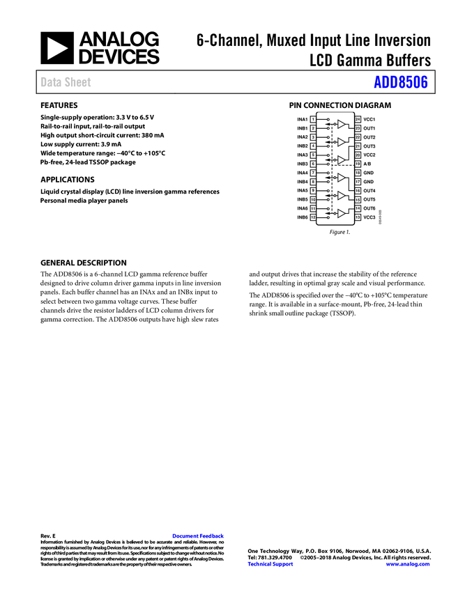 ADD8506 6-Channel, Muxed Input Line Inversion LCD Gamma Buffer