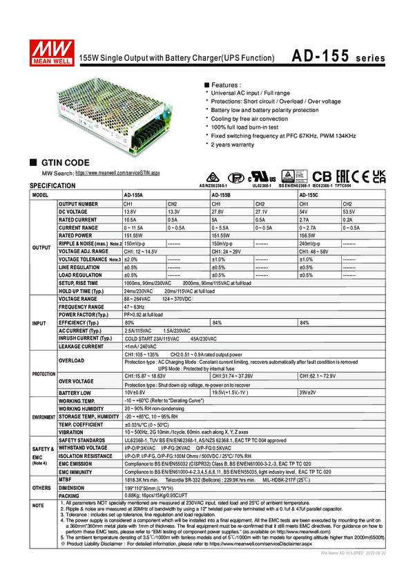 AD-155C Zasilacz z wyjściem do ładowania akumulatora 155W 54V 2.7A. 53.5V 0.5A AD-...
