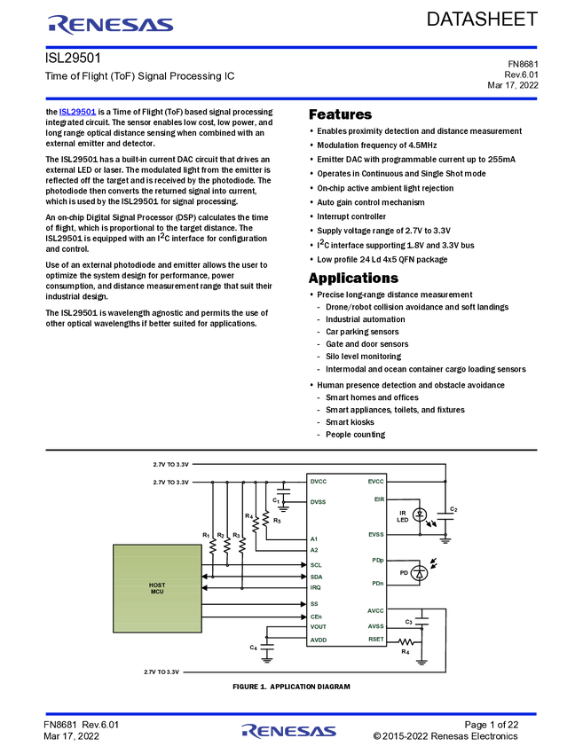 ISL29501 Time of Flight (ToF) Signal Processing IC