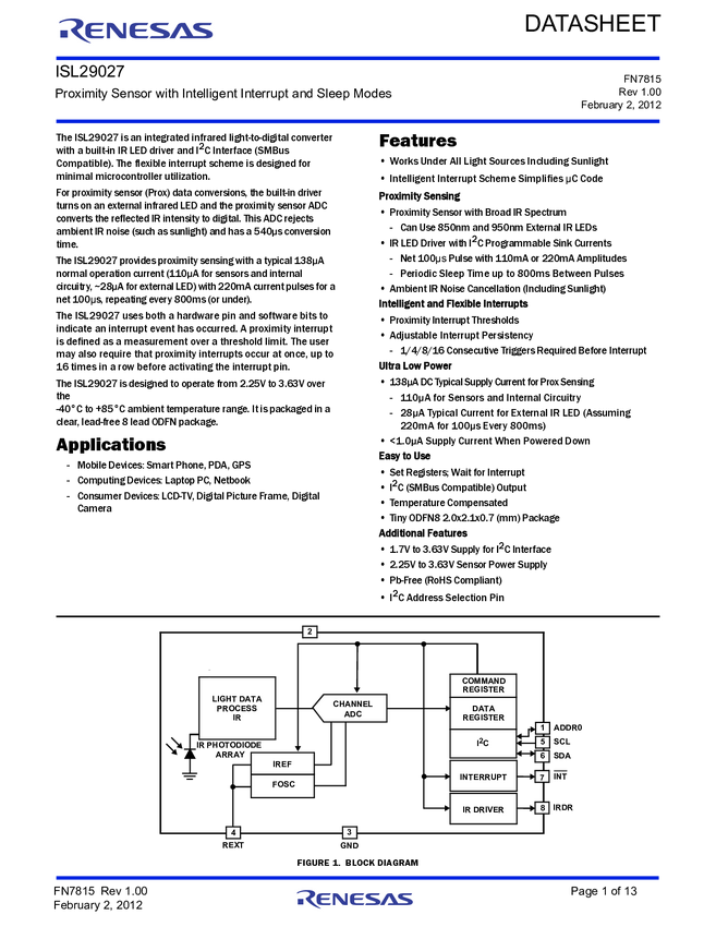 ISL29027 Proximity Sensor with Intelligent Interrupt and Sleep Modes