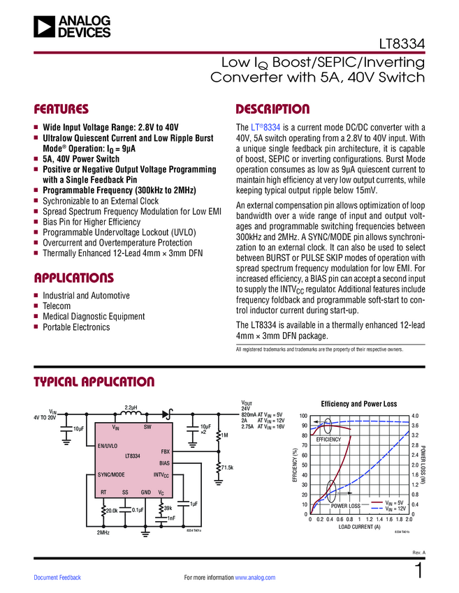 LT8334 Low I Boost/SEPIC/Inverting Converter with 5A, 40V Switch