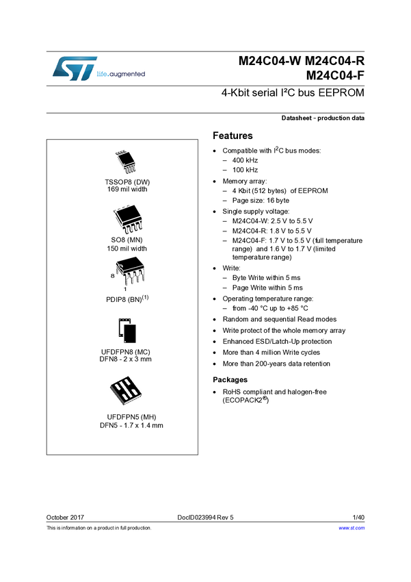M24C04 Pamięć EEPROM 24C04 ST SO8 (SMD), –40°C do +85°C