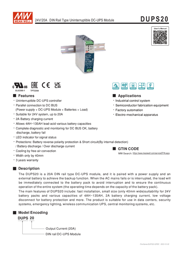 DUPS20 Moduł buforowy UPS 24~29V 20A MEAN WELL DUPS20
