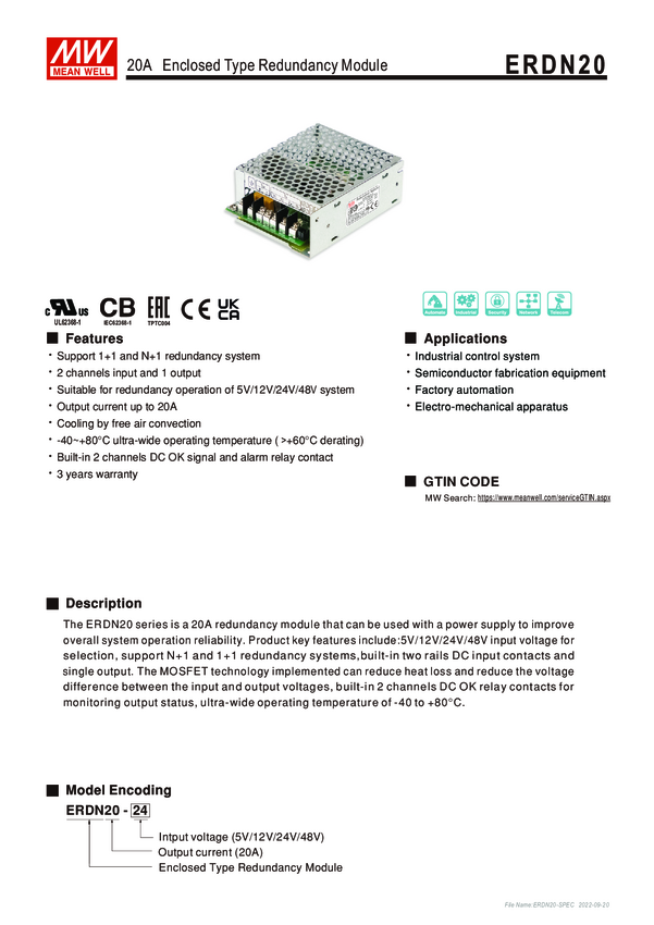 ERDN20-24 Moduł zasilania redundantnego 24V 20A MEAN WELL ERDN20-24