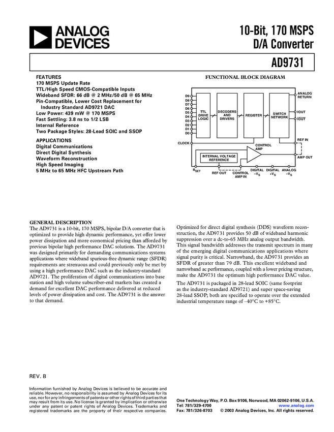 AD9731 l0-Bit, 170 MSPS, Bipolar D/A Converter