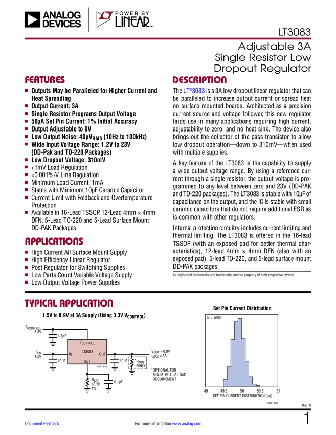 LT3083 Adjustable 3A Single Resistor Low Dropout Regulator