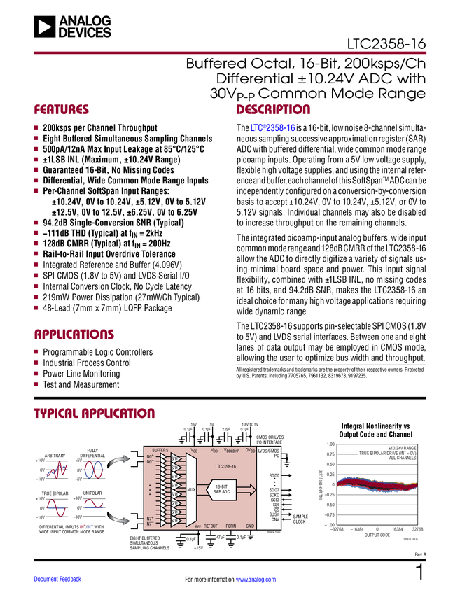 LTC2358-16 Buffered Octal, 16-Bit, 200ksps/Ch Differential ±10.24V ADC with 30V Common...