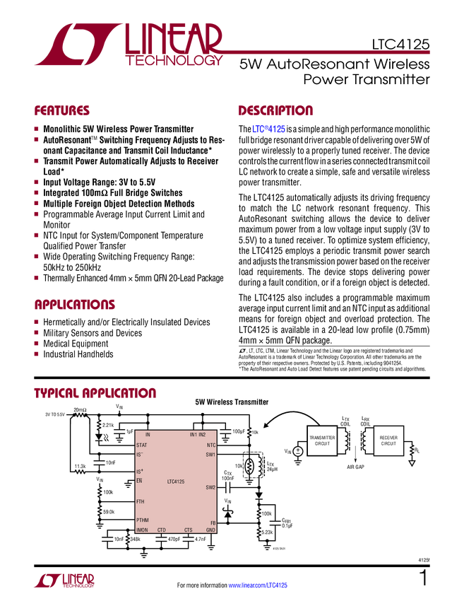 LTC4125 5W AutoResonant Wireless Power Transmitter