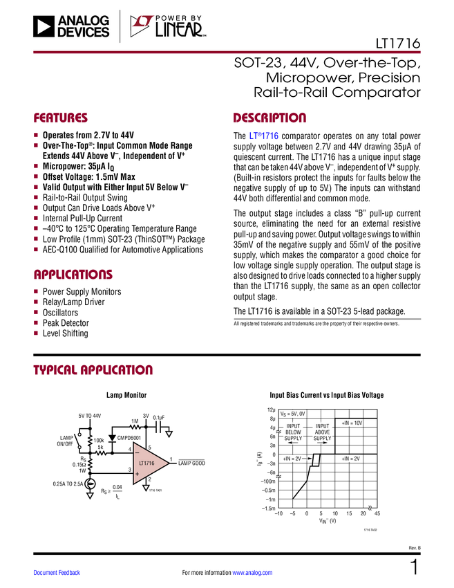 LT1716 SOT-23, 44V, Over-The-Top, Micropower, Precision Rail-to-Rail Comparator