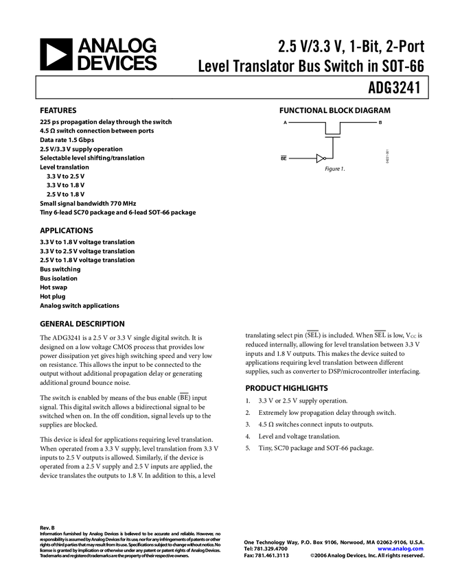 ADG3241 2.5 V/3.3 V, 1 - Bit, 2 - Port Level Translator Bus Switch