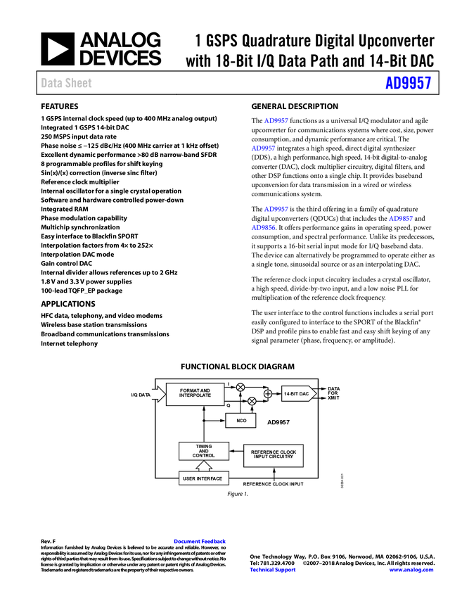 AD9957 1 GSPS Quadrature Digital Upconverter with 18-Bit I/Q Data Path and 14-Bit...