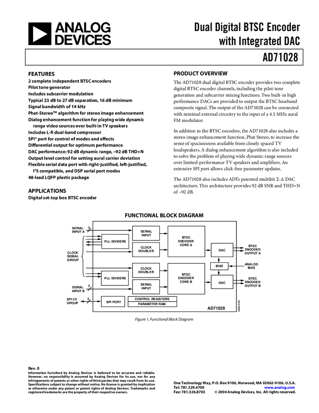 AD71028 Dual Digital BTSC Encoder with Integrated DAC