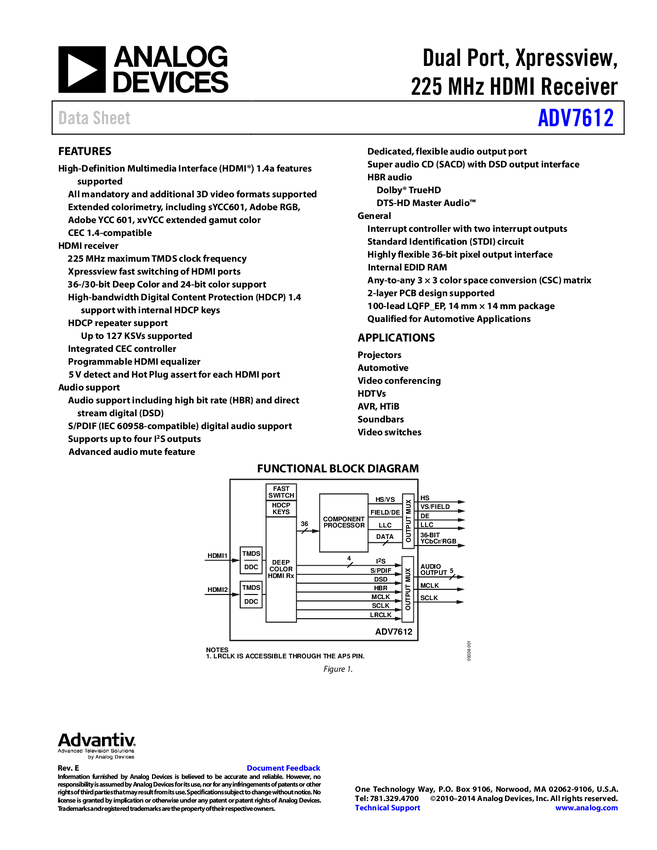 ADV7612 Dual Port, Xpressview, 225 MHz HDMI Receiver