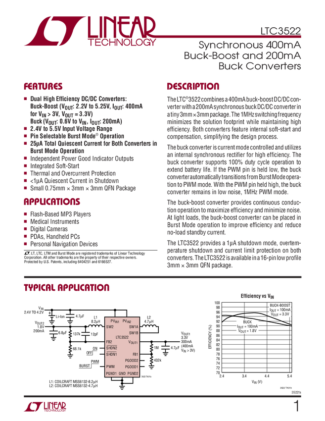 LTC3522 Synchronous 400mA Buck-Boost and 200mA Buck Converters