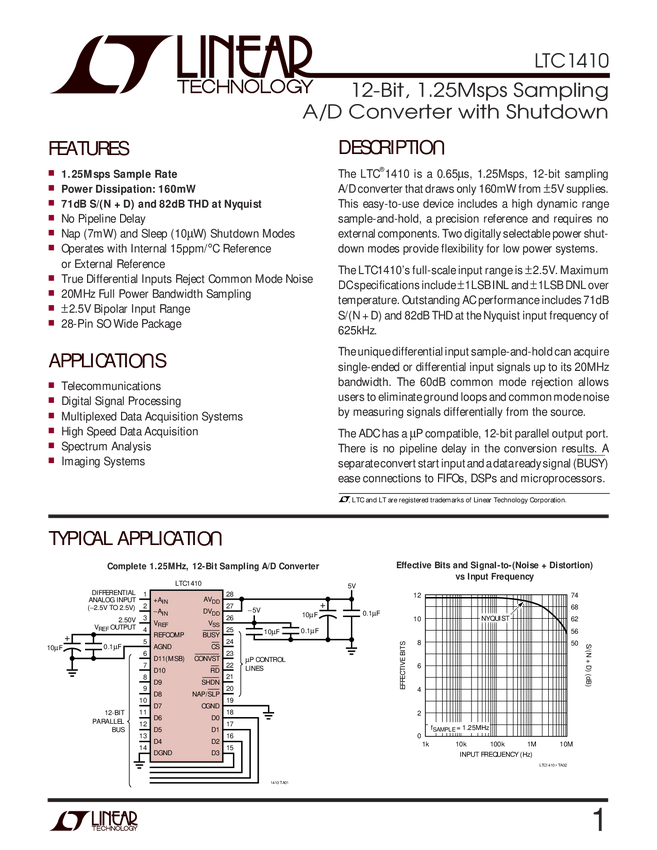 LTC1410 12-Bit, 1.25Msps, Sampling A/D Converter with Shutdown