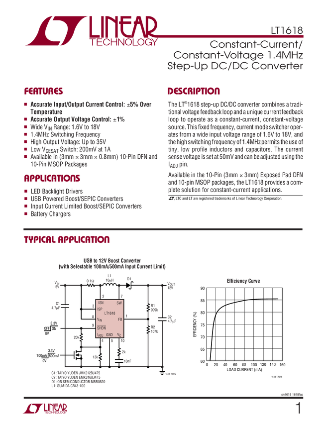 LT1618 Constant-Current/Constant-Voltage 1.4MHz Step-Up DC/DC Converter