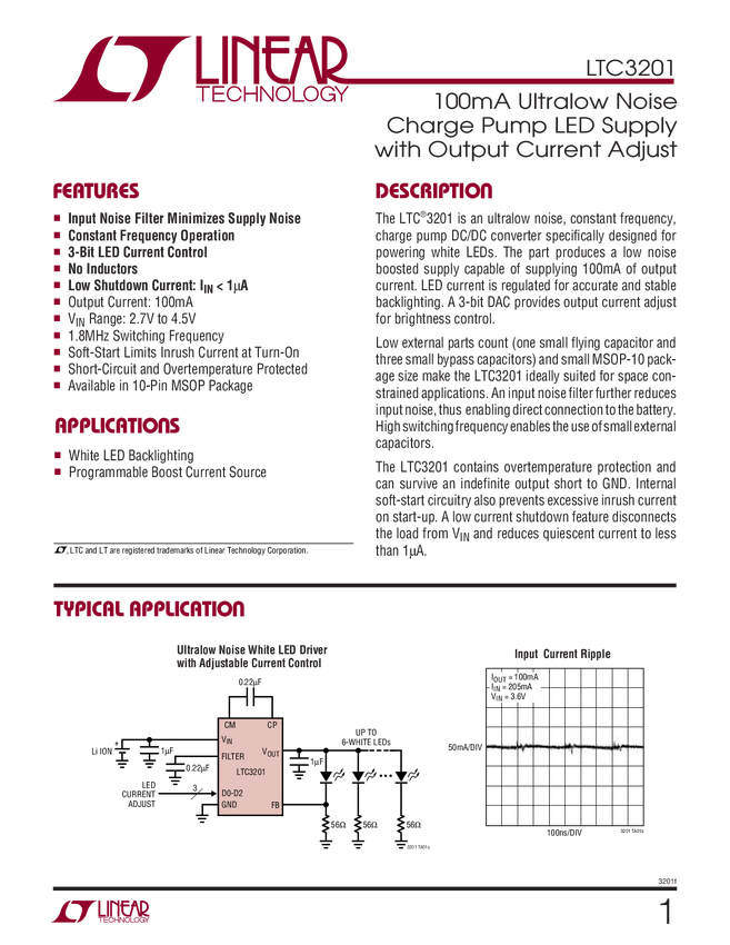 LTC3201 100mA Ultralow Noise Charge Pump LED Supply with Output Current Adjust