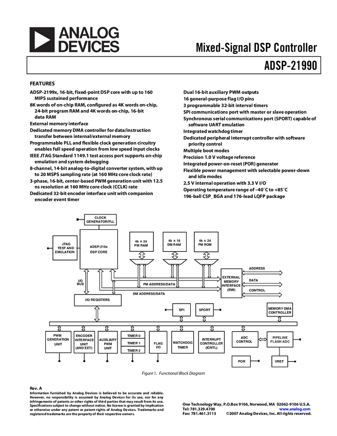 ADSP-21990 High-Performance Mixed-Signal DSP, 160 MHz, 4K Words Program Memory RAM