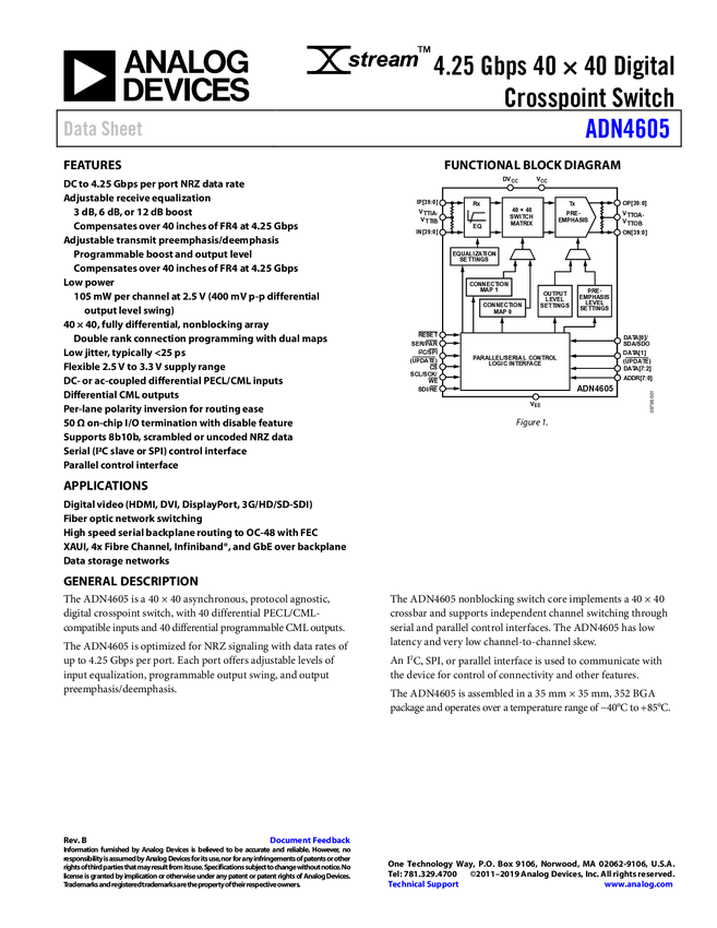 ADN4605 X-Stream™ 4.25 Gbps 40 × 40 Digital Crosspoint Switch