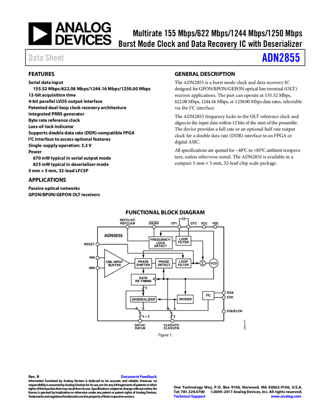 ADN2855 Multirate 155 Mbps/622 Mbps/1244 Mbps/1250 Mbps Burst Mode Clock and Data R...
