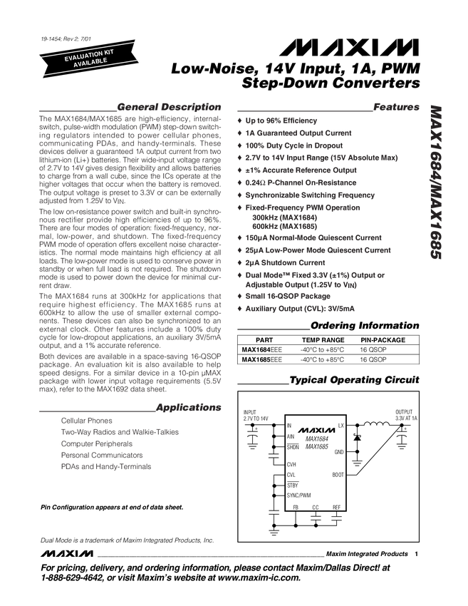 MAX1685 Low-Noise, 14V Input, 1A, PWM Step-Down Converters