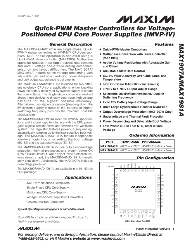 MAX1907A Quick-PWM Master Controllers for Voltage-Positioned CPU Core Power Supplies...