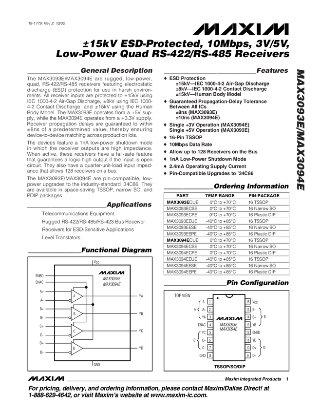 MAX3093E ±15kV ESD-Protected, 10Mbps, 3V/5V, Low-Power Quad RS-422/RS-485 Receivers