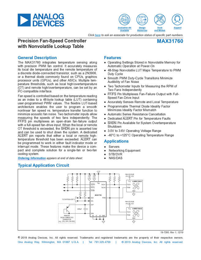 MAX31760 Precision Fan-Speed Controller with Nonvolatile Lookup Table