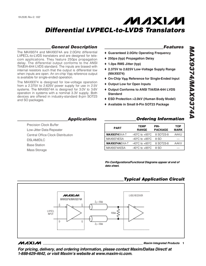 MAX9374A Differential LVPECL-to-LVDS Translators