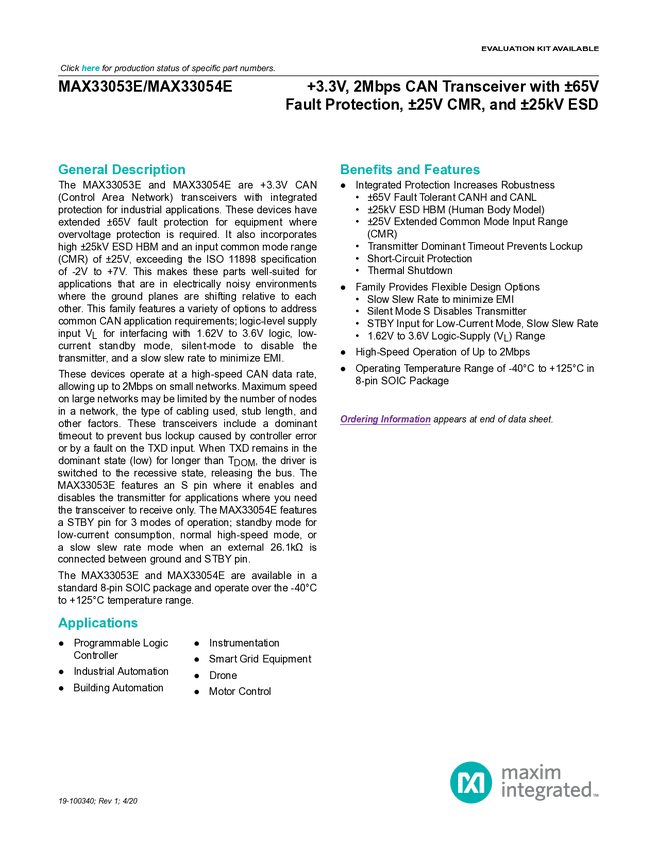 MAX33053E +3.3V, 2Mbps CAN Transceiver with ±65V Fault Protection, ±25V CMR, and ±25k...