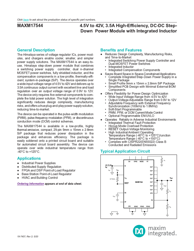 MAXM17544 4.5 to 42V, 3.5A High-Efficiency, DC-DC Step-Down Power Module with Integra...