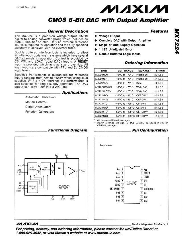 MX7224 CMOS, Double-Buffered, 8-Bit DAC with Voltage-Output Amplifier