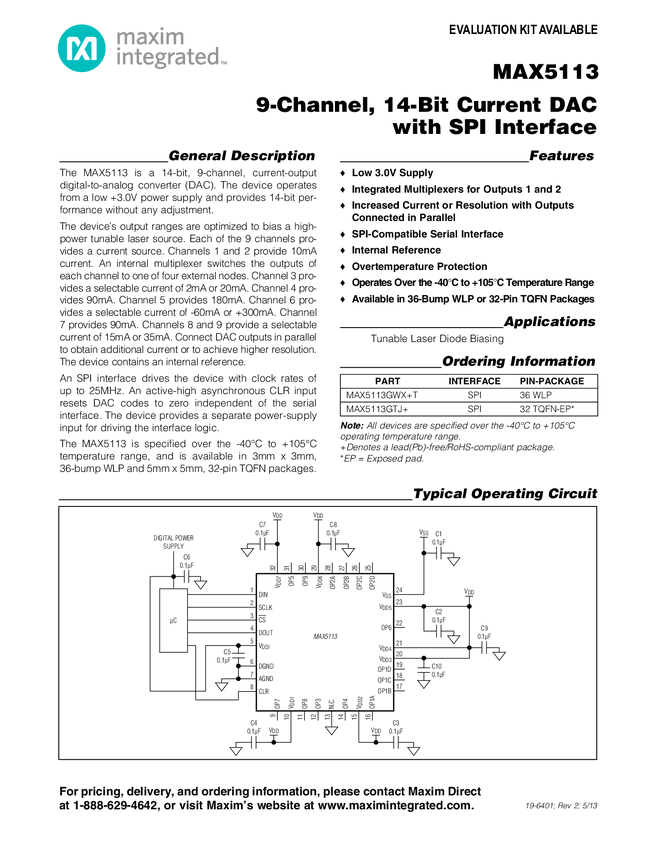 MAX5113 9-Channel, 14-Bit Current DAC with SPI Interface