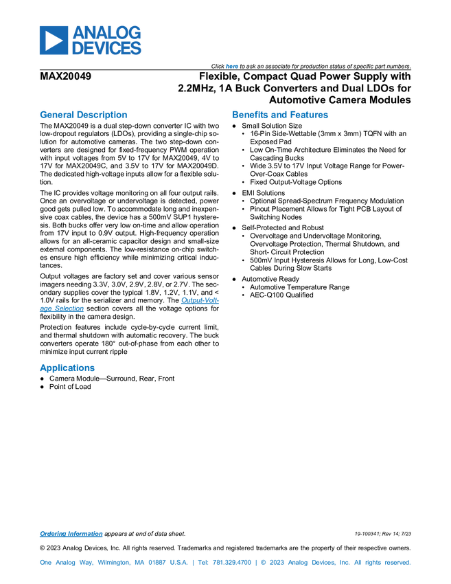 MAX20049 Flexible, Compact Quad Power Supply with 2.2MHz, 1A Buck Converters and Dua...