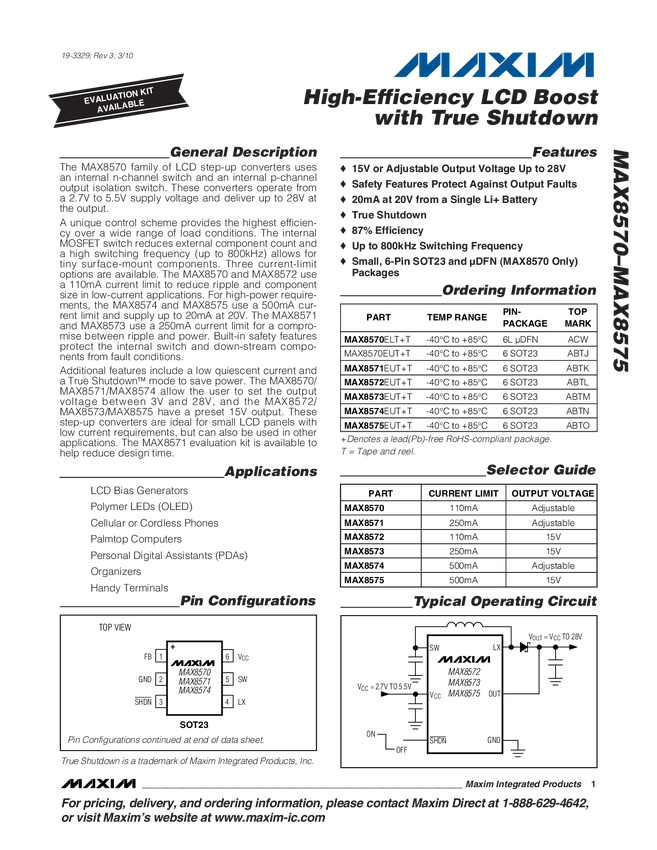 MAX8570 High-Efficiency LCD Boost with True Shutdown