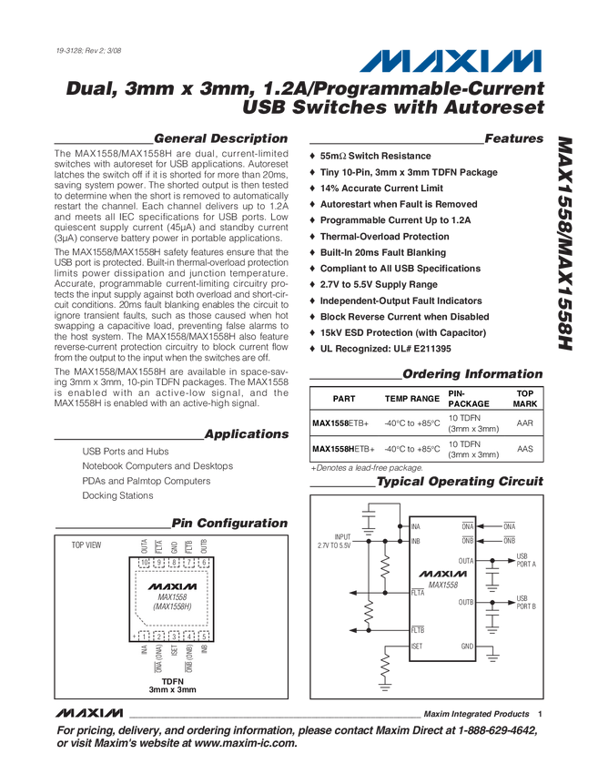 MAX1558H Dual, 3mm x 3mm, 1.2A/Programmable-Current USB Switches with Autoreset