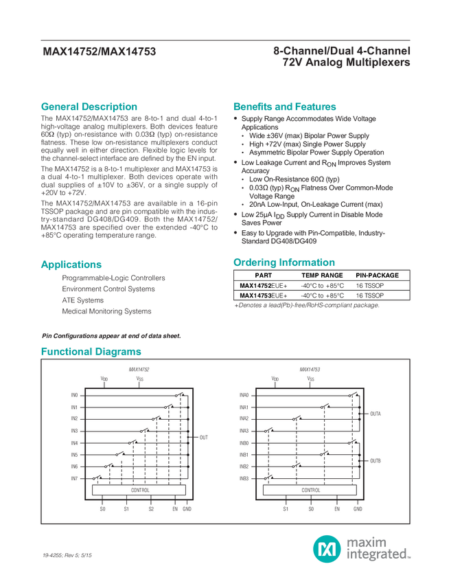 MAX14752 8-Channel/Dual 4-Channel 72V Analog Multiplexers