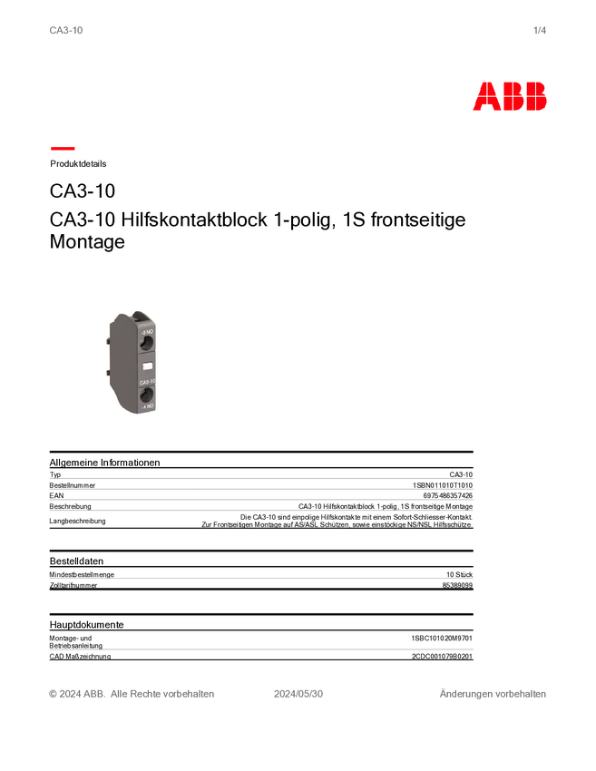 1SBN011010T1010 Przełącznik pomocniczy ABB CA3-10 1 NO 1 szt.