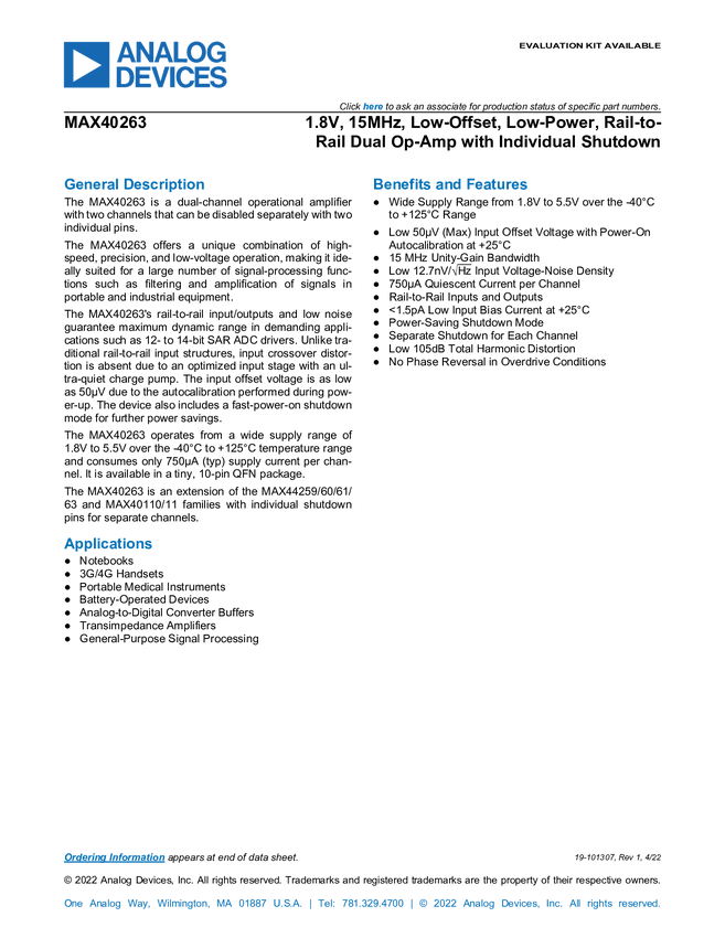 MAX40263 1.8V, 15MHz, Low-Offset, Low-Power, Rail-toRail Dual Op-Amp with Individual...