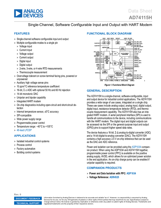 AD74115H Single-Channel, Software Configurable Input and Output with HART Modem