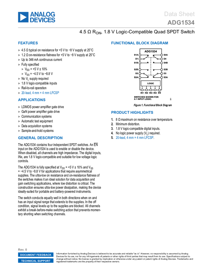 ADG1534 4.5 Ω R, 1.8 V Logic-Compatible Quad SPDT Switch