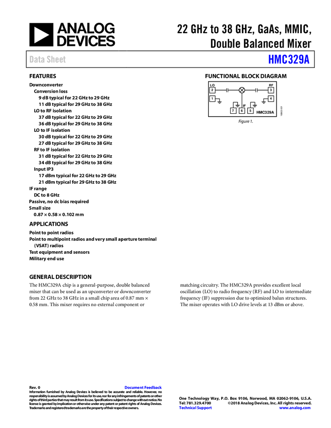 HMC329A-Die 22 GHz to 38 GHz, GaAs, MMIC, Double Balanced Mixer