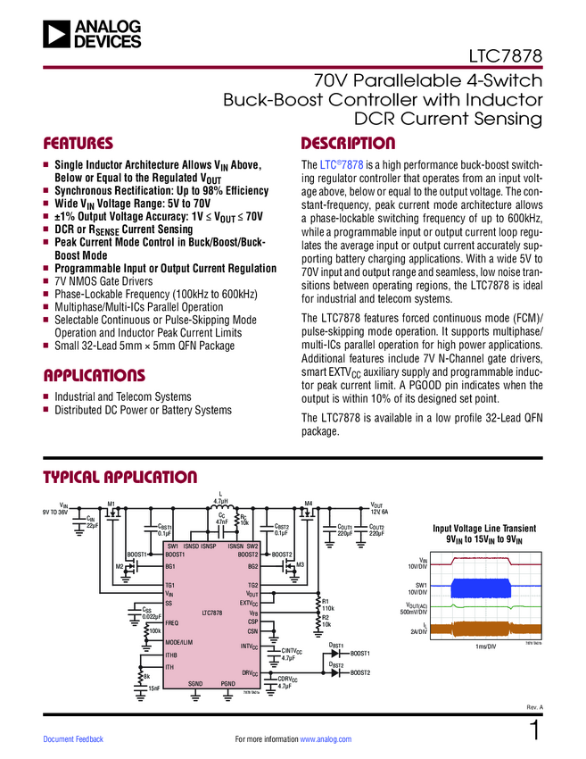 LTC7878 70V Parallelable 4-Switch Buck-Boost Controller with Inductor DCR Current S...